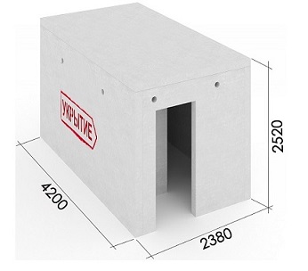 Защитное сооружение гражданского назначения быстрого возведения согласно стандарту ГОСТ 42.4.08-2021 имеет внешние размеры 4200×2400×2520 мм и включает проем размером 2000×800 мм. Внутри конструкции предусмотрена бетонная перегородка, защищающая находящихся внутри людей от проникновения осколков через дверь. Основные характеристики изделия включают: